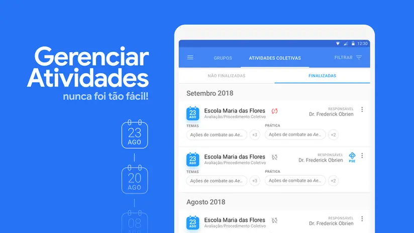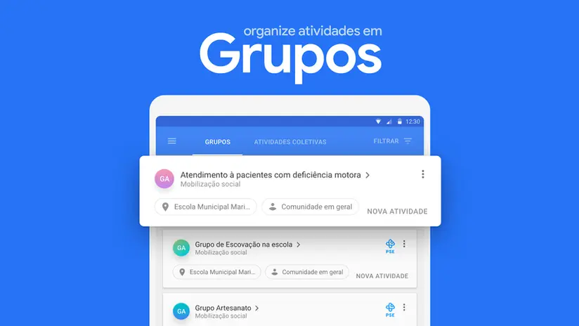 O e-SUS APS AC dá suporte à realização de Atividades Coletivas na Atenção Primária à Saúde, tanto em ações de promoção à saúde da comunidade quanto para questões administrativas das equipes. O aplicativo, além de informar reuniões de equipe, permite cadastrar e gerir grupos de atividades, participantes e avaliações, o que antes era realizado só através de fichas CDS.